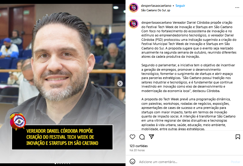 Vereador Daniel Cordóba porpõe criação do Festival Tech Week de Inovação e Startups em São Caetano