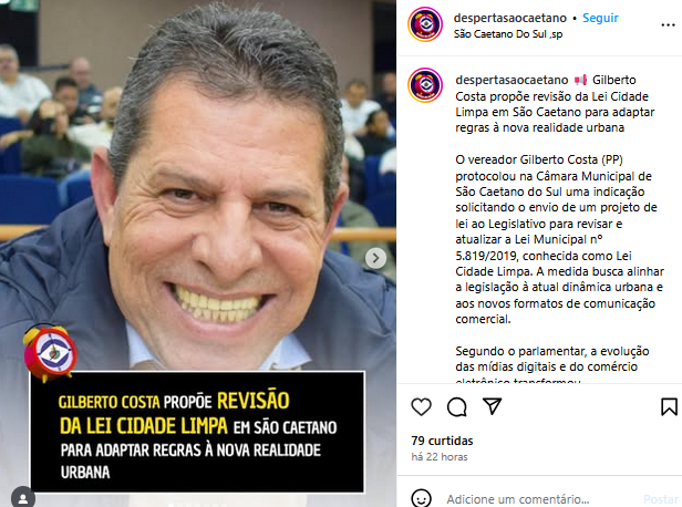 Gilberto Costa propõe revisão da Lei Cidade Limpa em São Caetano para adaptar regras à nova realidade urbana
