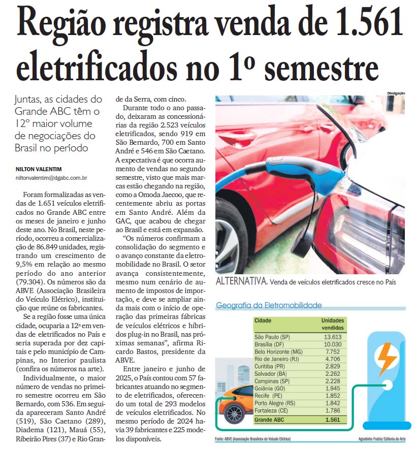Região registra venda de 1.561 eletrificados no 1º semestre