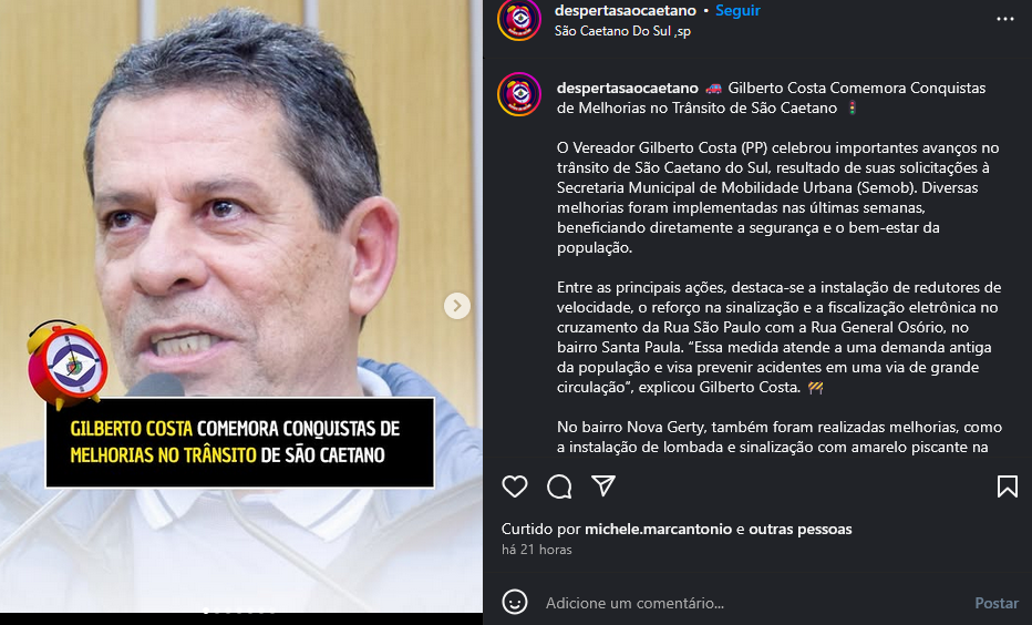Gilberto Costa comemora conquistas de melhorias no trânsito de São Caetano