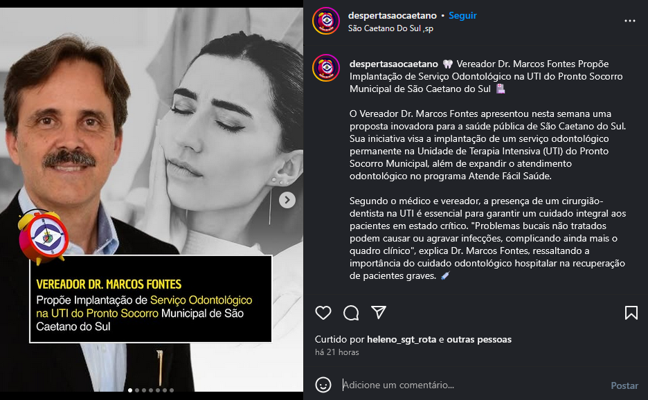 Vereador Marcos Fontes propõe implantação de serviço odontológico na UTI do Pronto Socorro Municipal de São Caetano