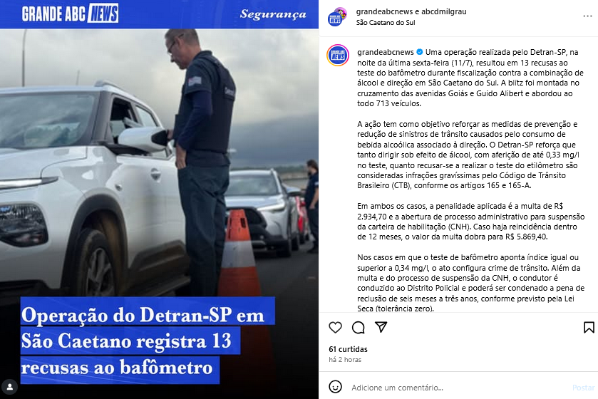 Operação Detran-SP em São Caetano registra 13 recusas ao bafômetro