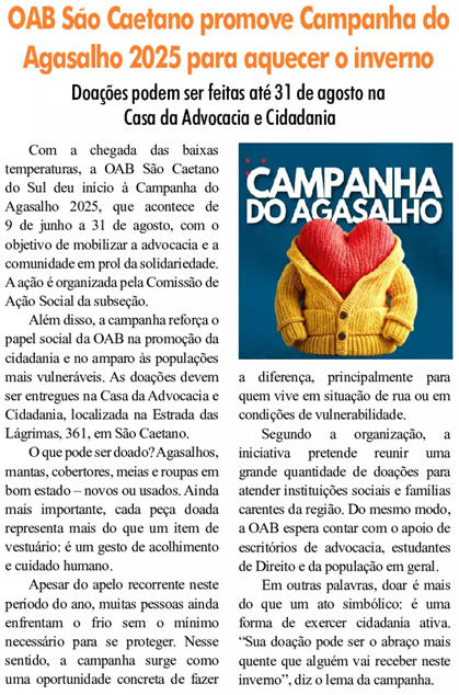 OAB São Caetano promove Campanha do Agasalho 2025 para aquecer o inverno