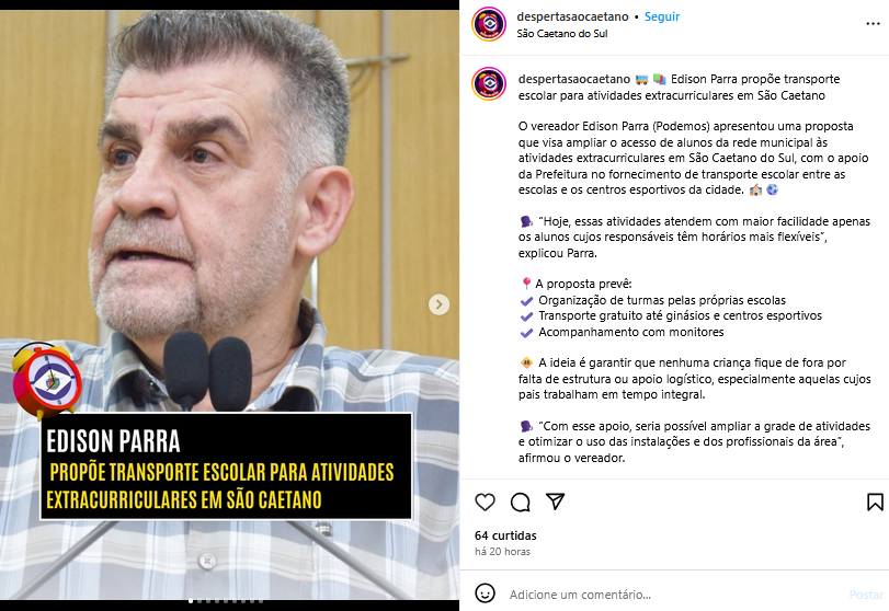 Edison Parra propõe transporte escolar para atividades extracurriculares em São Caetano