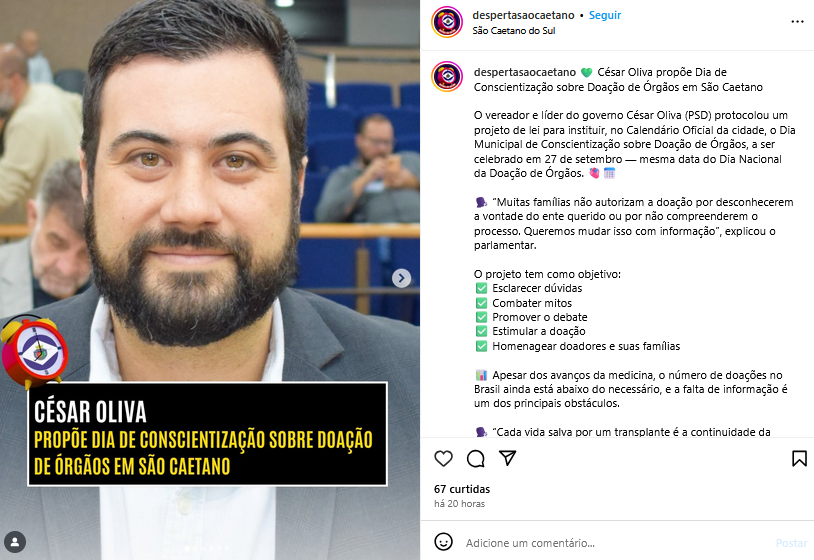 César Oliva propõe Dia de Conscientização sobre Doação de Órgãos em São Caetano
