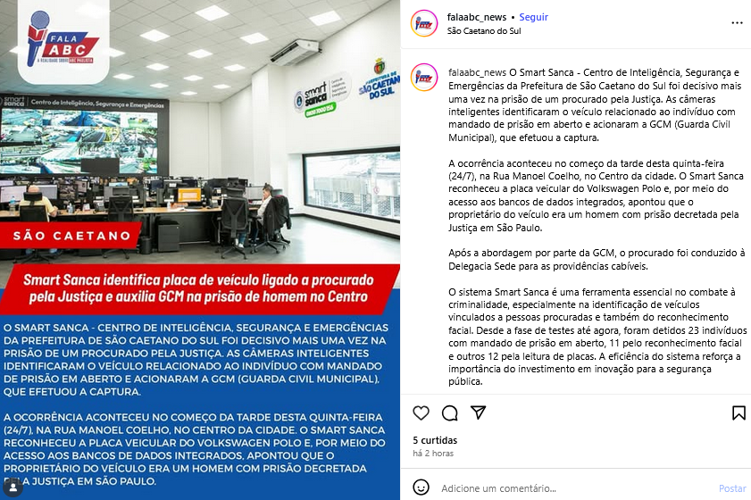 Smart Sanca identifica placa de veículo ligado a procurado pela Justiça e auxilia GCM na prisão de homem no Centro