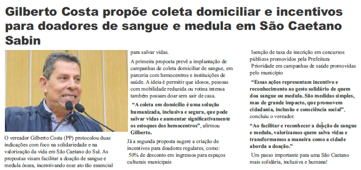 Gilberto Costa propõe coleta domiciliar e incentivos para doadores de sangue e medula em São Caetano Sabin