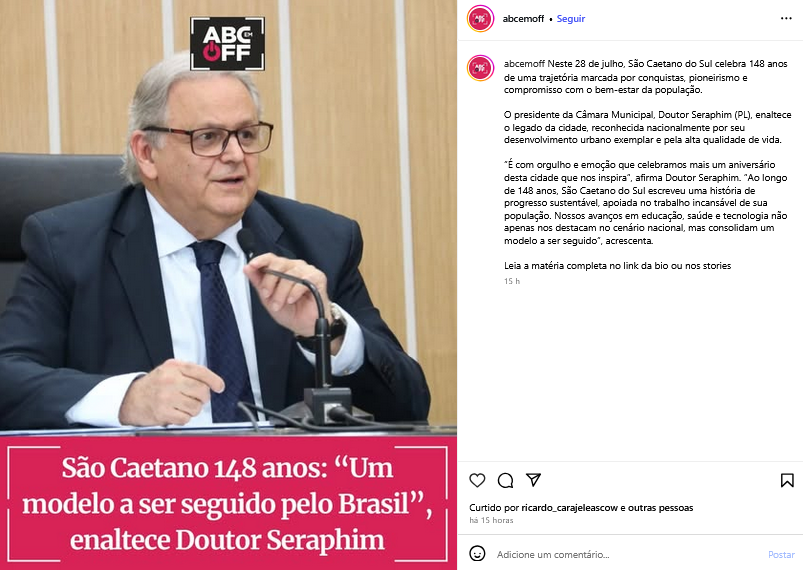 São Caetano 148 anos: "Um modelo a ser seguido pelo Brasil", enaltece Doutor Seraphim
