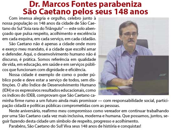 Dr. Marcos Fontes parabeniza São Caetano pelos seus 148 anos