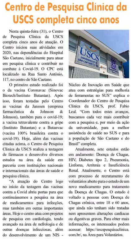 Centro de Pesquisa Clínica da USCS completa cinco anos