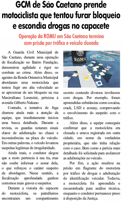 GCM de São Caetano prende motociclista que tentou furar bloqueio e que escondia drogas no capacete