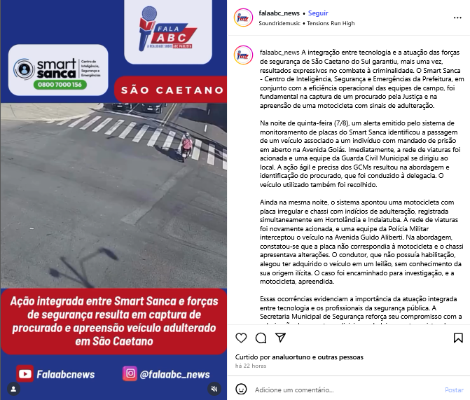 Ação integrada entre Smart Sanca e forças de segurança resulta em captura de procurado e apreensão veículo adulterado em São Caetano