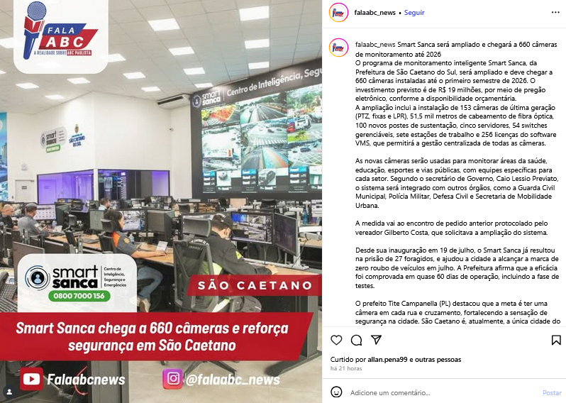 Smart Sanca chega a 660 câmeras e reforça segurança em São Caetano
