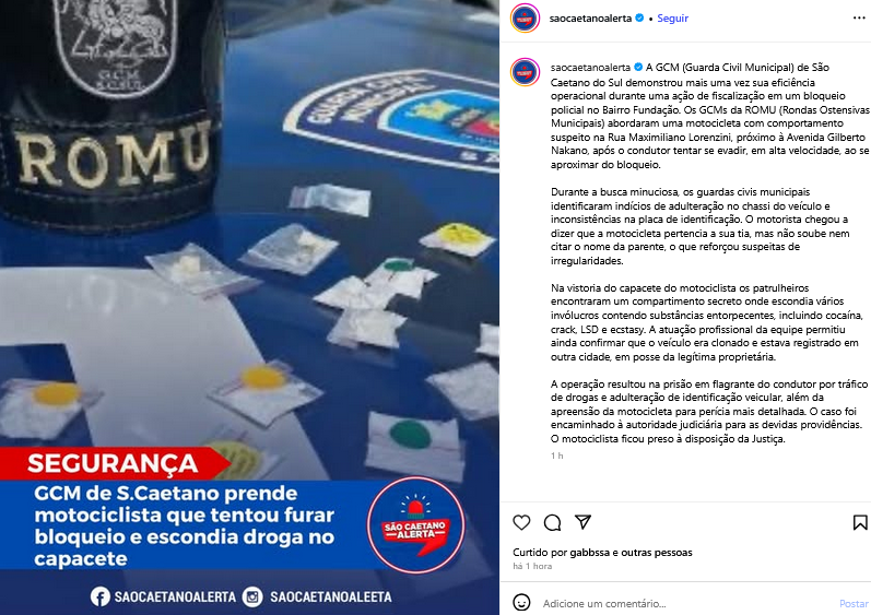 GCM de S.Caetano prende motociclista que tentou furar bloqueio e que escondia drogas no capacete
