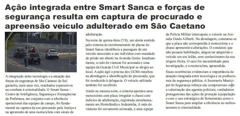 Ação integrada entre Smart Sanca e forças de segurança resulta em captura de procurado e apreensão veículo adulterado em São Caetano