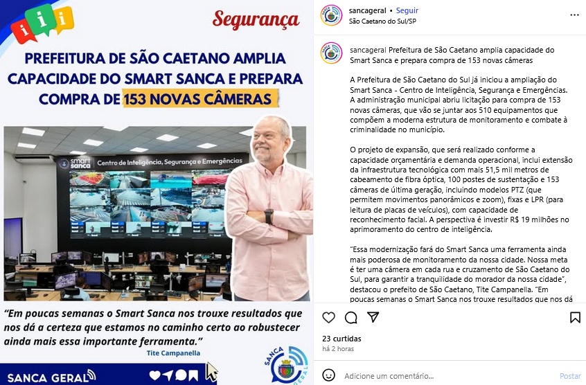 Prefeitura de São Caetano amplia capacidade do Smart Sanca e prepara compra de 153 novas câmeras