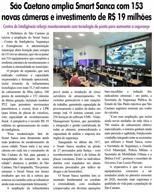 São Caetano amplia capacidade do Smart Sanca e prepara compra de 153 novas câmeras