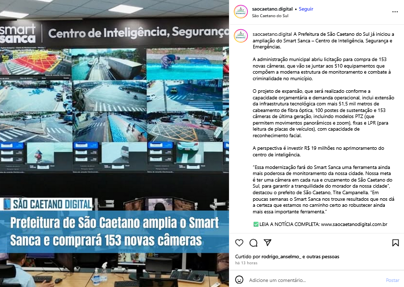Prefeitura de São Caetano amplia capacidade do Smart Sanca e prepara compra de 153 novas câmeras