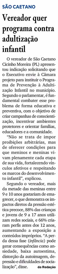 Vereador quer programa contra adultização infantil