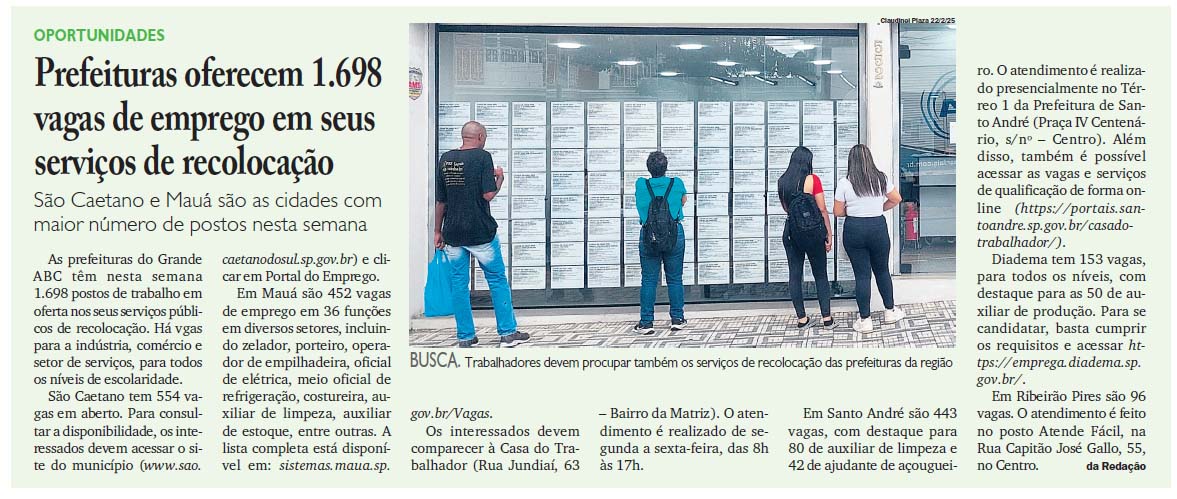 Prefeituras oferecem 1.698 vagas de emprego em seus serviços de recolocação