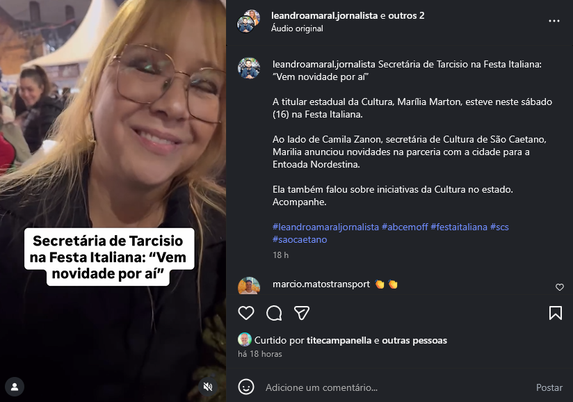 Secretária de Tarcísio na Festa Italiana: "Vem novidade por aí"
