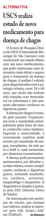 USCS realiza estudo de novo medicamento para doença de chagas