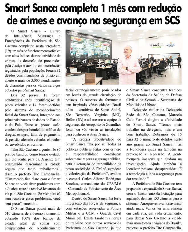 Smart Sanca completa 1 mês com redução de crimes e avanço na segurança em São Caetano