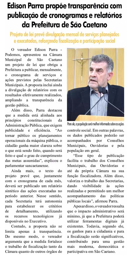 Edson Parra propõe transparência com publicação de cronogramas e relatórios da Prefeitura de São Caetano