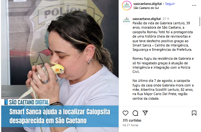 Smart Sanca ajuda a localizar calopsita desaparecida em São Caetano