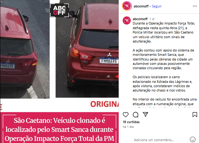 Veículo clonado é localizado pelo Smart Sanca durante Operação Impacto Força Total da PM