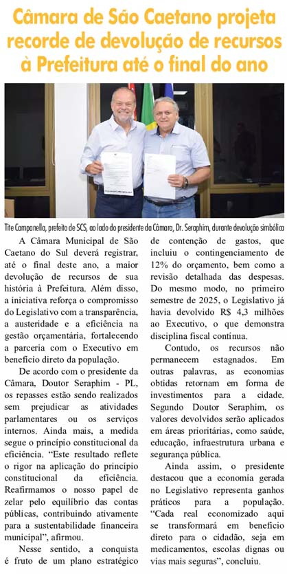 Câmara de São Caetano projeta recorde de devolução de recursos à Prefeitura até o final do ano
