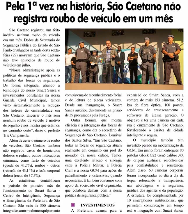 Pela 1ª vez na história, São Caetano não registra roubo de veículo em um mês