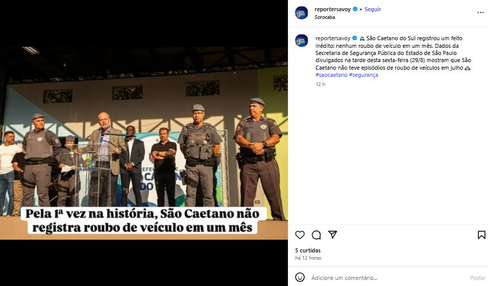 Pela 1ª vez na história, São Caetano não registra roubo de veículo em um mês