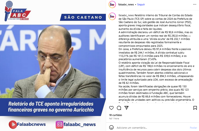 Relatóriodo do TCE aponta irregularidades financeiras graves no governo Auricchio