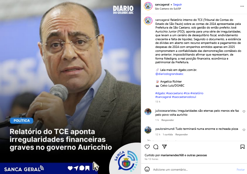 Relatório do TCE aponta irregularidades financeiras graves no governo Auricchio