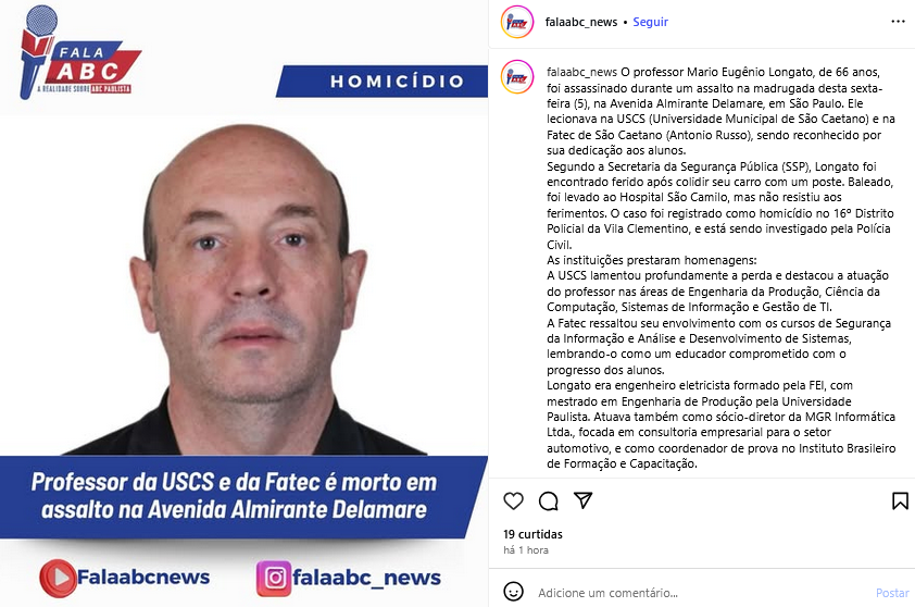 Professor da USCS e Fatec é morto em assalto na Almirante Delamare