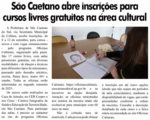 Prefeitura de São Caetano abre inscrições para cursos livres gratuitos na área cultural