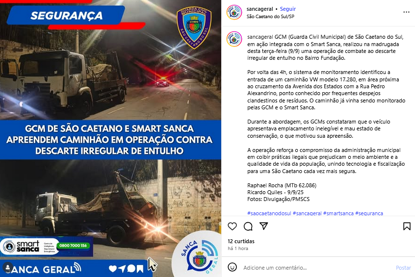 GCM de São Caetano e Smart Sanca apreendem caminhão em operação contra descarte irregular de entulho