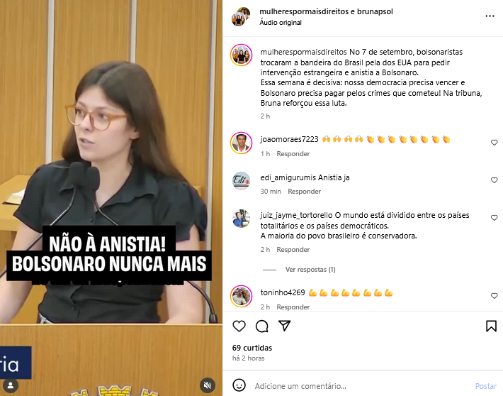 Não à anistia! Bruna reforçou essa luta
