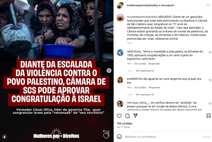 Diante de genocídio contra o povo palestino, Câmara de S. Caetano quer congratular Israel