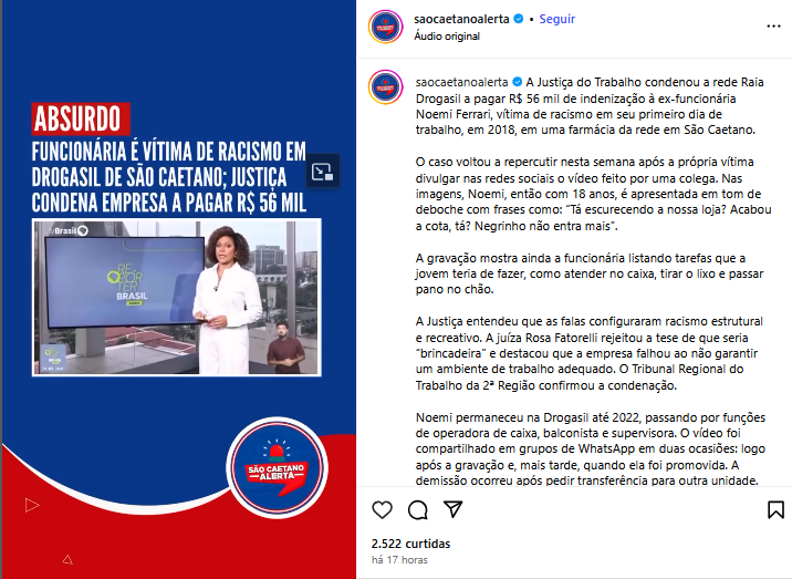 Funcionária é vítima de racismo em Drogasil de SCS; justiça condena empresa a pagar R$ 56 mil