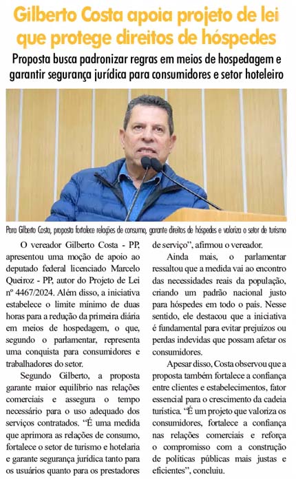 Gilberto Costa apoia projeto de lei que protege direitos de hóspedes