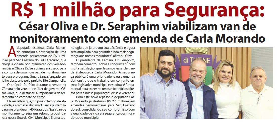 R$ 1 milhão para Segurança: César Oliva e Dr. Seraphim viabilizam van de monitoramento com emenda de Carla Morando