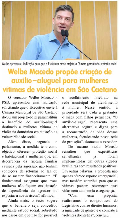Welbe Macedo propõe auxílio-aluguel para mulheres vítimas de violência em São Caetano