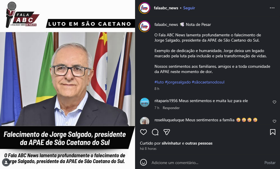 Falecimento de Jorge Salgado, presidente da APAE de São Caetano do Sul