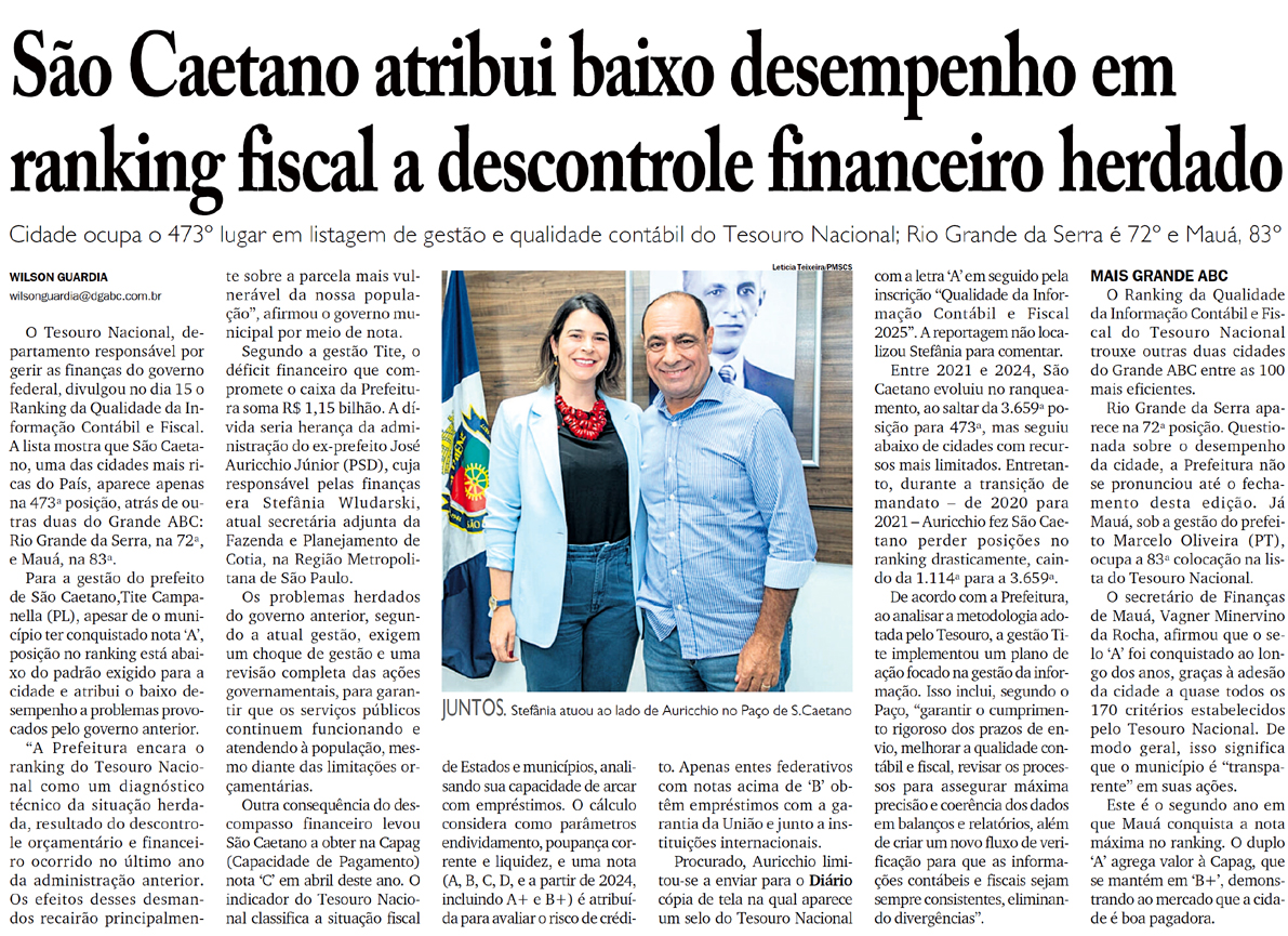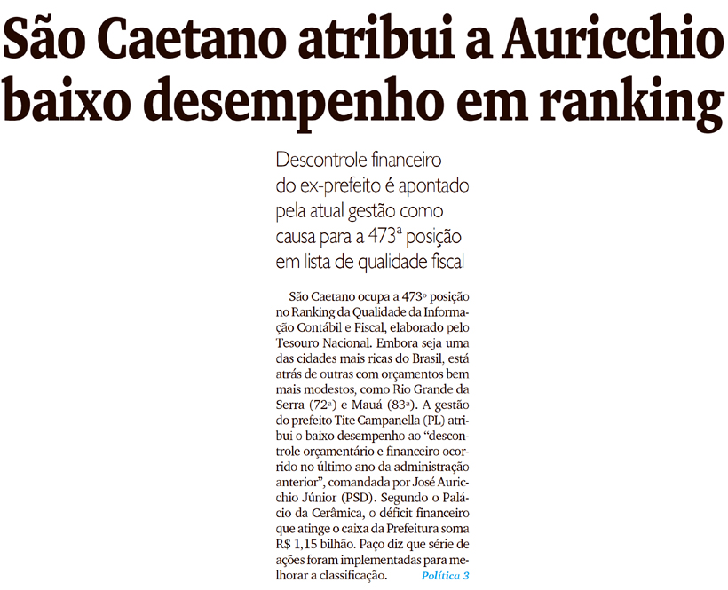 São Caetano atribui baixo desempenho em ranking fiscal a descontrole financeiro herdado