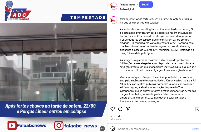 Após fortes chuvas na tarde de ontem, 22/09, o Parque Linear entrou em colapso