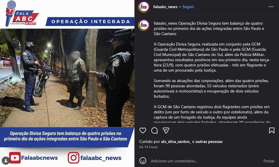 Operação Divisa Segura tem balanço de quatro prisões no primeiro dia de ações integradas entre São Paulo e São Caetano