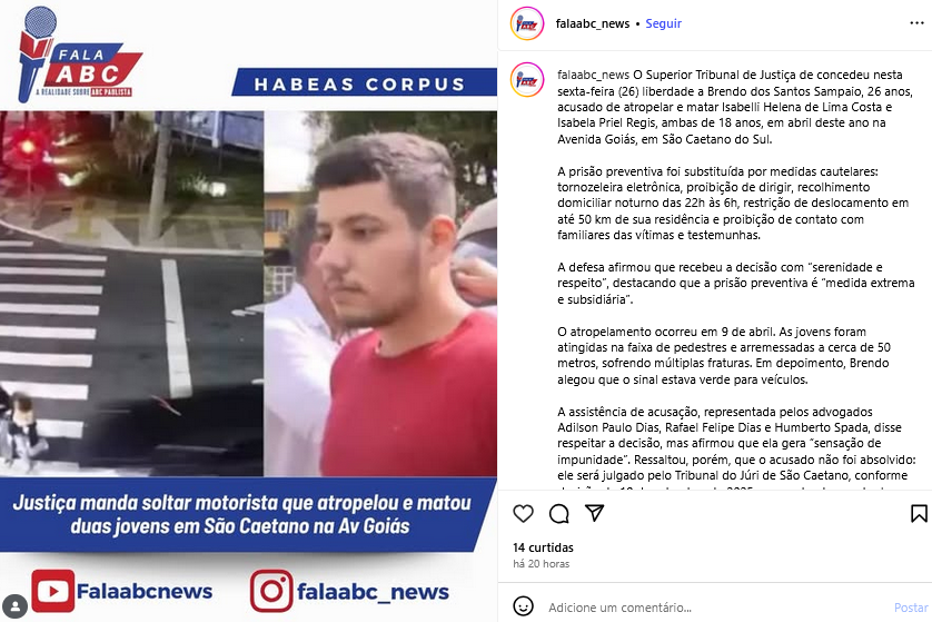 Justiça manda soltar motorista que atropelou e matou duas jovens em São Caetano na Av. Goiás