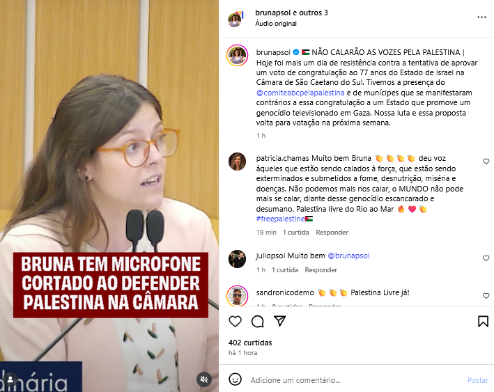 Bruna tem microfone cortado ao defender Palestina na Câmara